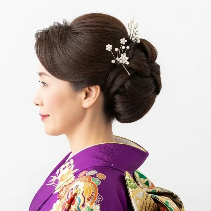 ミディアムからロングヘアの方に最もおすすめなのが、シンプルなシニヨンです。髪を一つにまとめてお団子を作り、ヘアピンで固定するだけで、落ち着いた和装スタイルになります。トップに少しボリュームを持たせると、若々しく仕上がります。結び目の部分にべっ甲のかんざしやパールのヘアピンを加えると、よりフォーマルな雰囲気になります。